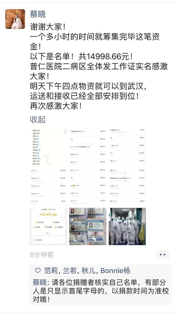 一边为妹妹自豪且担忧着,一边又心疼她们防护用品的短缺。平时就热爱生活的她,结识了许多热心的朋友,大家看到朋友圈她的揪心和呼吁,纷纷从各种渠道提供帮助。她所在的小区美食妈妈群更是发起了募捐,短短两个小时,57位姐妹就凑齐了1.5万元,通过爱心人士的帮助,购买了1000件手术防护衣,悉数捐给武汉市普仁医院感染科。