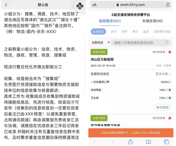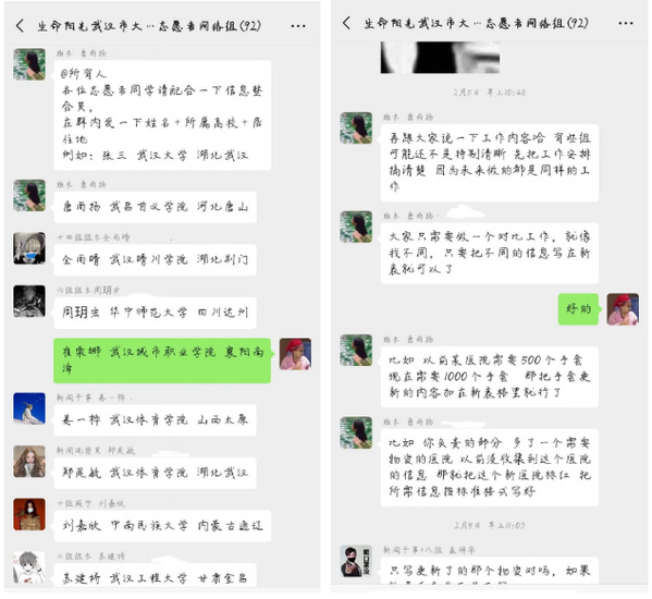 电子商务1902 温小丽。我在2月3日进入对接医院组工作,负责汉南区中医医院和武汉仁生医院的对接工作。主要是询问各医院所需物资、联系人姓名电话等内容,并在第一时间将信息传达给工作组。记录物资极其短缺的医院,将他们放在第一位。医院接受的物资以快递的形式发送,我也需要每天关注快递状态,向负责人反映。同时,我积极在朋友圈更新动态,搜寻更多的物资。从2月3号到现在,依然在尽我所能提供一点帮助,什么时候停止呢?等疫情结束吧!