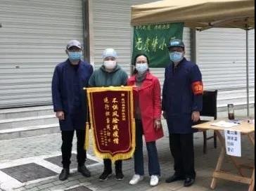 “不惧风险战疫情,逆行担当践初心”。下沉公园社区物资公寓两位老师——栾运生和朱靖老师捧着居民们送来的锦旗,心里溢满了温暖。业主代表刘新建(市肺科医院退休医生)说:“咱们社区自疫情发生以来,你们每天都在帮忙搞卫生、消杀,管理得井然有序,防控措施严密及时,正是因你们社区和下沉干部的辛勤付出和奉献,冒着风雨还在一户一户的排查和宣传防疫知识,不分白天黑夜的值守,才有了他们小区80多天的安全和无疫情小区这样的成果,他们看在眼里,感动在心里。这面锦旗是物资公寓所有居民对你们的谢意”。