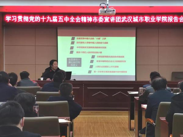 11月26日,学习贯彻党的十九届五中全会精神市委宣讲团武汉城市职业学院报告会在南校区行政楼举行。市委宣讲团成员、学校马克思主义学院院长彭国平教授对党的十九届五中全会精神作宣讲报告。全体校领导、全体中层干部出席报告会。