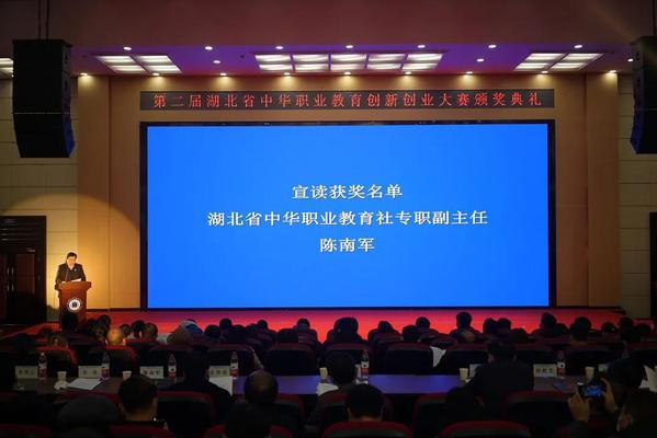 湖北省中华职业教育社专职副主任陈南军宣读第二届湖北省中华职业教育创新创业大赛获奖名单,指导老师易维、潘中锋等115名老师获得优秀指导教师奖,6所学校获得竞赛组织奖,5个单位获得优秀组织奖,我校在内的3所院校获得突出贡献奖。