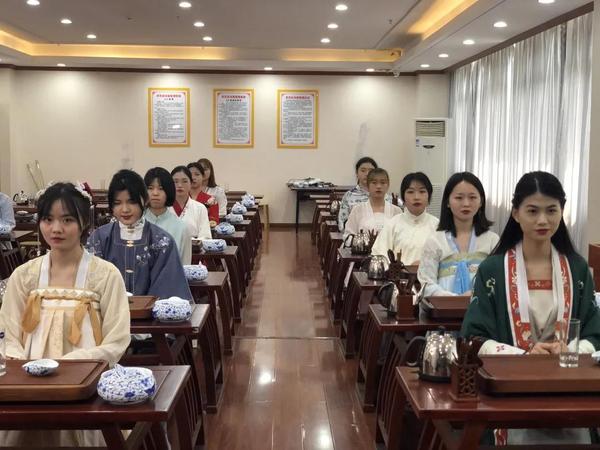 课程中,旅游管理专业的同学们身着端庄、优雅、大气的汉服,跟着老师反复练习“冰心去凡尘、甘露润莲心、凤凰三点头、春波展旗枪”的茶艺动作,杯中的茶水如春波荡漾,茶叶慢慢舒展,随波舞蹈。课堂生动有趣。
