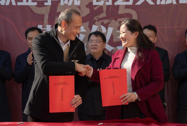 ▲学校副校长叶学文与赤壁市政府副市长甘志宝与签署了《乡村振兴文化共建战略合作协议》