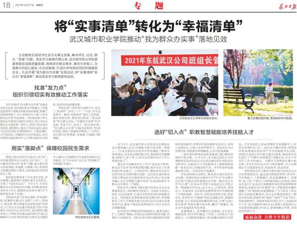 日前,长江日报大篇幅报道了学校在“我为群众办实事”活动中将“实事清单”转化为“幸福清单”落地见成效。
