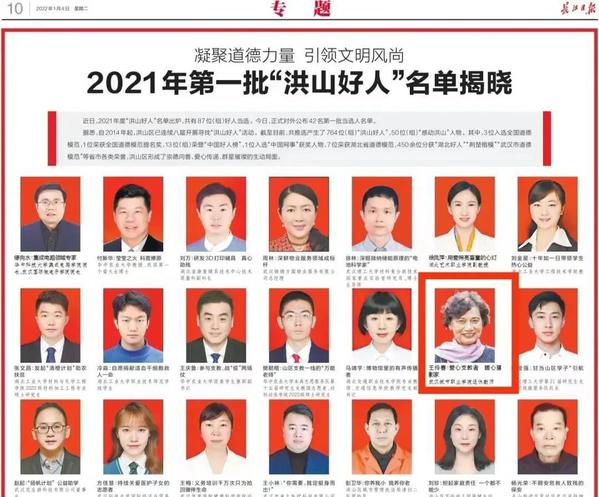 近日,长江日报刊登2021年第一批“洪山好人”名单,我校退休教师王伶春获此殊荣。