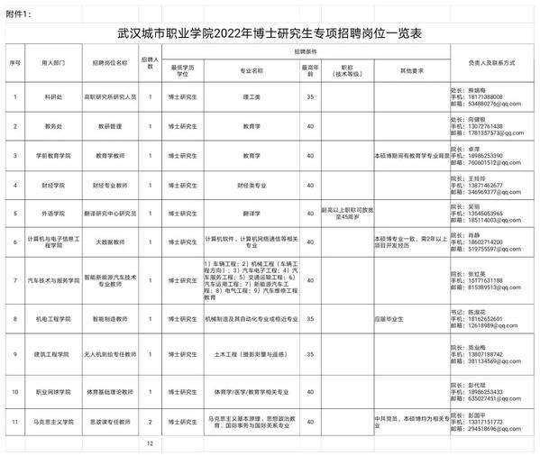 附件1:武汉城市职业学院2022年博士研究生专项招聘岗位一览表(2).xlsx