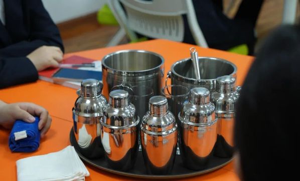 课堂以回顾鸡尾酒百年历史开始,落脚到本次课程的主题:鸡尾酒制作方法——摇和法。两校主讲老师按照新识探索、实践操练、成果评估、课堂小结的教学环节共同开展同步课堂的实施。