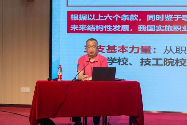 湖北城市建设职业技术学院王佑华教授在南区机电学院报告厅作了主题为“学习《职业教育法》的若干体会与思考”的现场专题报告。报告中,王佑华教授以自己多年的职业教育研究经验,总结了《职业教育法》法律体系与制度体系、现代职业教育体系、新时代职业教育发展指针等内容,并对湖北实施《职业教育法》提出了建设性的建议。