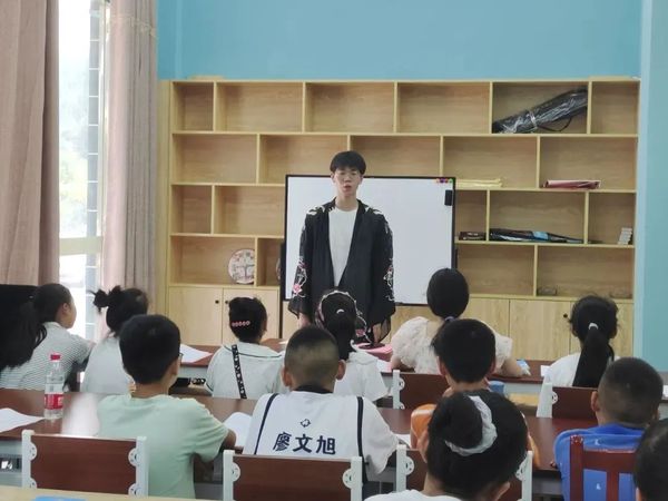 在“雏鹰班”语言课中,志愿者黄杰同学对乡村孩子进行培训,让乡村孩子朗诵古诗,根据老师的节奏一起诵诗,体会古诗中的韵味,共同感受古诗的魅力。这样不仅培养了乡村孩子古诗文的鉴赏能力,也锻炼了乡村孩子的普通话能力。