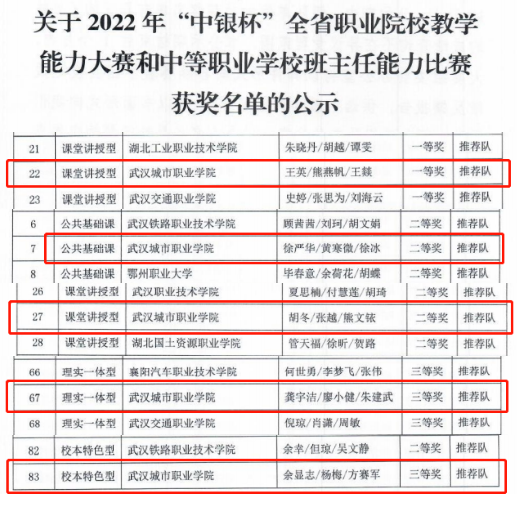 日前,湖北省职业院校教学能力大赛传来捷报,学校5支参赛队获奖,其中一等奖1个、二等奖2个、三等奖2个,在全省名列前茅。