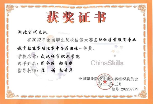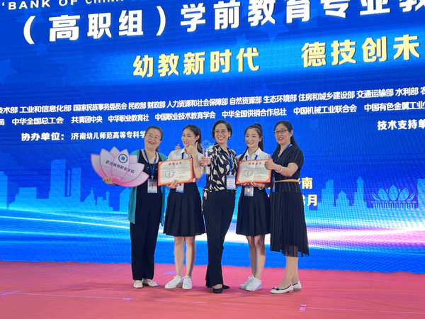 8月31日,2022 年全国职业院校技能大赛(高职组)学前教育专业教育技能赛项在济南落下帷幕。由学校学前教育学院周金连、向希彤组成的代表队,与全国68所职业院校的136名优秀学子同台竞技。经过激烈角逐,学校代表队荣获大赛一等奖,指导老师程娟、杨素苹获得“优秀指导教师”称号。这是学校代表湖北省在该赛项比赛中取得的历史最好成绩。