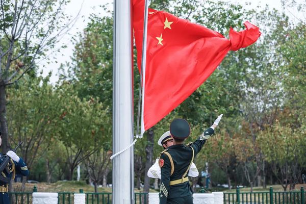 开学典礼在升国旗、唱国歌中拉开帷幕,校党委书记邓院方向承训部队赠送锦旗。