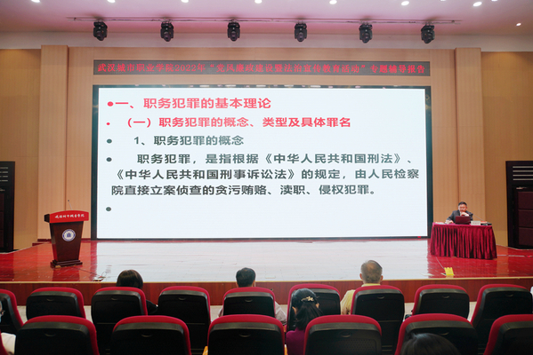 为深入学习贯彻习近平新时代中国特色社会主义思想和习近平法治思想,落实市委、市纪委有关工作部署,推进“清廉学校”建设,教育引导干部职工以案为鉴、警钟长鸣,进一步增强法纪观念和廉洁意识,进一步筑牢廉洁自律防线,不断提高拒腐防变能力,10月14日下午,学校在南区学术报告厅召开预防职务犯罪法治宣讲活动,校党委书记邓院方和校党委副书记、校长张英等在校校领导出席,常务副校长段永发主持,全校各部门副科级(含)以上、各学院正科级(含)以上干部以及学校纪检监察机构工作人员参与活动。