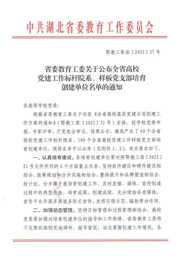 近日,湖北省委教育工委公布了全省高校党建工作标杆院系、样板党支部培育创建单位名单,学校初等教育学院学工党支部成功入选样板党支部培育创建单位。