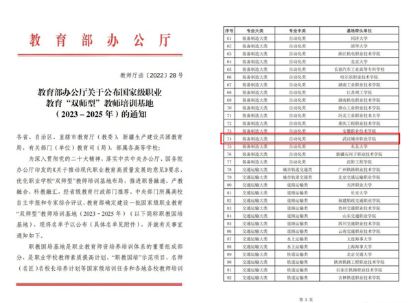 近日,教育部办公厅印发《关于公布国家级职业教育“双师型”教师培训基地(2023-2025年)的通知》,我校在众多申报院校中脱颖而出,成功入选国家级职业教育“双师型”教师培训基地(装备制造大类自动化类),湖北省仅5所高职院校入围,此次成功入选是教育部对学校综合办学实力及职业培训领域做出优异成绩的充分肯定和认可。同时学校作为核心成员参与华中师范大学申报的国家级职业教育“双师型”教师培训基地(教育与体育大类教育类)也成功入选。