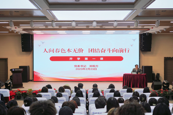 “回首过去,有涉滩之险,有爬坡之艰,有闯关之难,但我们在战胜一次次考验中成长,在克服一场场危机中发展,让希望的阳光照亮未来……”2月23日上午第一节课,财经学院103学术报告厅学生满座,大家听得专注、记得认真。讲台上,学校党委书记邓院方正在为建工学院、网球学院、外语学院和财经学院2022级部分班级学生讲授思政“开学第一课”。他以《人间春色本无价,团结奋斗向前行》为题,聚焦“三年抗疫怎么看,当前经济怎么办,我们应该怎么做”,系统分析了当前国家所面临的形势任务,准确指出了新时代大学生成长成才的前进方向。邓院方希望生逢其时、使命光荣的一代青年学生,厚植家国情怀、练就过硬本领、磨砺坚韧意志、发扬奋斗精神。同样,校长张英以《新学期 新气象 新征程 新作为》为题在机电学院报告厅与同学们展开分享交流,鼓舞学校师生在新的学期里吹响号角、争当先锋。