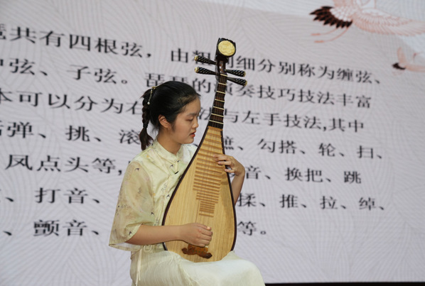 夏至真老师为同学们介绍了琵琶和中阮。琵琶又称“批把”,最早见于史载的是汉代刘熙《释名. 释乐器》,向前弹出称做批,向后挑进称做把,因此根据它演奏的特点而命名为“批把”。大约在魏晋时期,为了与当时的琴、瑟等乐器在书写上统一起来,便正式称为“琵琶”。夏至真为同学们演奏了经典武曲《十面埋伏》片段以及文曲《春江花月》。