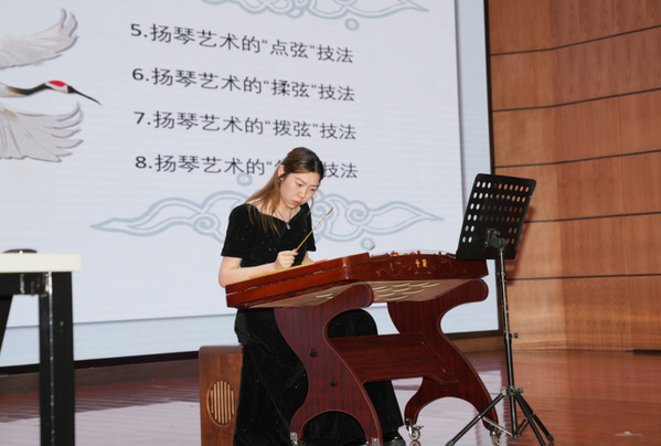 湖北艺术职业学院的贺智慧老师为大家介绍了扬琴的历史文化、结构演变、基本演奏技法(包括轮竹、单竹、齐竹、颤竹、点弦、揉弦、拨弦、勾弦)、以及中国扬琴的四大流派(江南丝竹扬琴、广东扬琴、四川扬琴、东北扬琴)。她主要介绍了江南丝竹扬琴,并演奏了著名扬琴曲目《弹词三六》片段、四川扬琴代表曲目《将军令》片段、以及现代扬琴乐曲《夏·雨》。