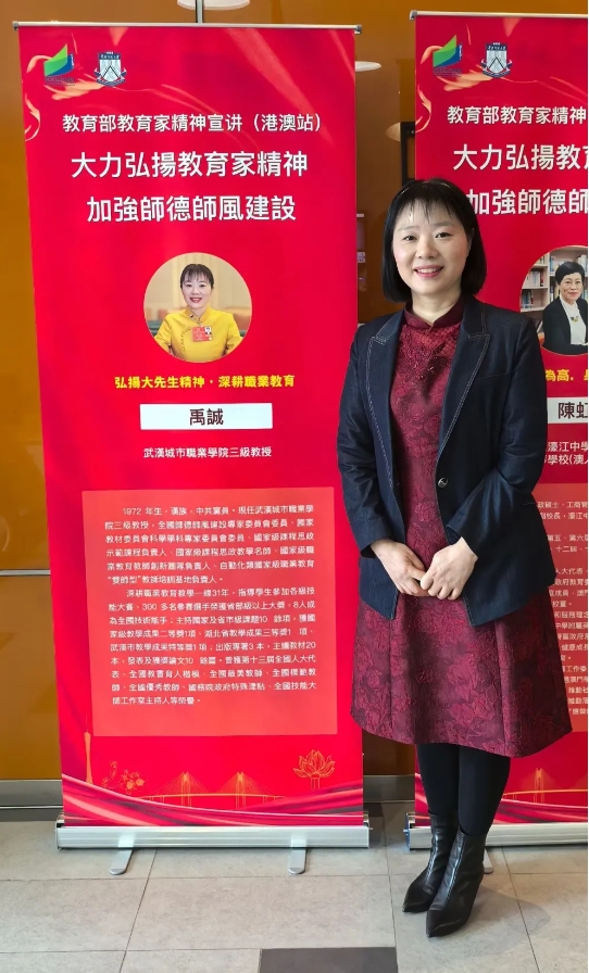 全国教书育人楷模、全国最美教师、学校机电工程学院院长禹诚教授作为职业教育的代表,以“弘扬大先生精神,深耕职业教育”为题宣讲教育家精神。这是继担任职业教育教师队伍弘扬践行教育家精神研讨会代表、作为全国职业院校唯一教师代表在央视六集纪录片《教育家精神》出镜讲述教育故事后,禹诚再一次作为职业教育的代表宣讲教育家精神。