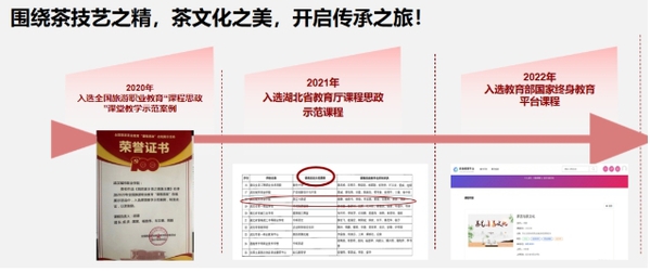 《茶艺与茶道》课程由旅游与酒店管理学院副教授胡璟主讲,课程扎根荆楚大地,以“茶”为媒,思政教学引领厚植高水平建设,云端优化管理助力教学变革,非遗创新传承打造精品课程,深化科教融汇推进产教融合,课后数智服务赋能特色育人,让每一个学生的发展需求、个性特质都能够得到关注,育技能型人才、育应用型人才、育新时代人才。