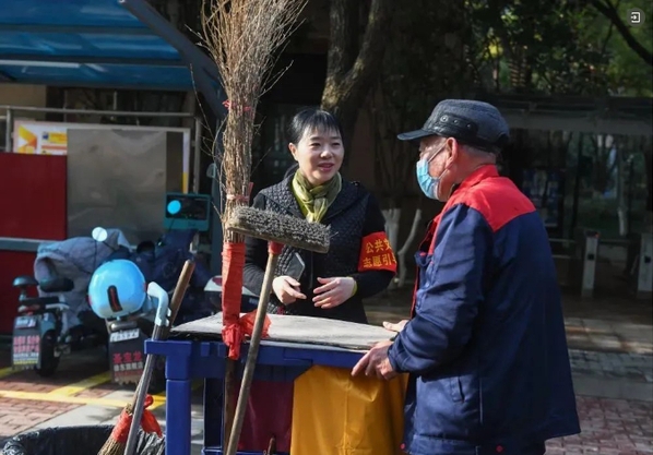禹诚(左)在武汉市洪山区和平街爱家国际社区了解卫生排班情况