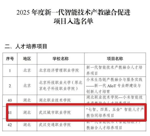 近日,教育部职业教育发展中心发布《2025年度新一代智能技术产教融合促进项目入选名单》(教职中心〔2025〕18号)。由学校计算机与电子信息工程学院申报的“‘七智、四真、五金’智能人才产教协同培养项目”成功入选人才培养项目。该项目自发布后,共收到256所高等职业院校(含本科层次)提交的487项有效申报。经专家遴选,最终确定入选项目171个(其中应用创新项目100个,人才培养项目67个,职教出海项目4个)。