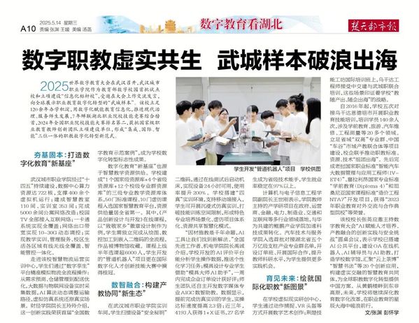 楚天都市报以“数字职教虚实共生,武城样本破浪出海”为题,报道了学校作为教育部数字校园首批试点校和立项建设“信息化标杆校”,用数字化赋能教育信息化,推进现代治理、服务师生发展,形成“集成、国际、智能”三位一体的职教数字化转型新范式。以下为报道全文: