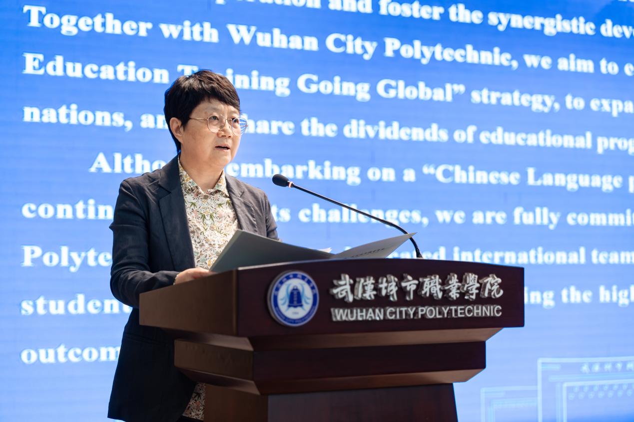 湖北省教育厅对外合作交流处处长梁薇在讲话中肯定了学校在国际化办学方面的努力,包括不断优化机制、健全机构、内培外引,打造了专业高效的国际化团队等。她表示,湖北省教育厅积极推动湖北职业教育“走出去”“引进来”双向发展,学校作为湖北省“具有较高国际化水平职业学校”,连续11年深耕中非职教合作,成果显著,彰显了湖北职业教育的国际影响力。
