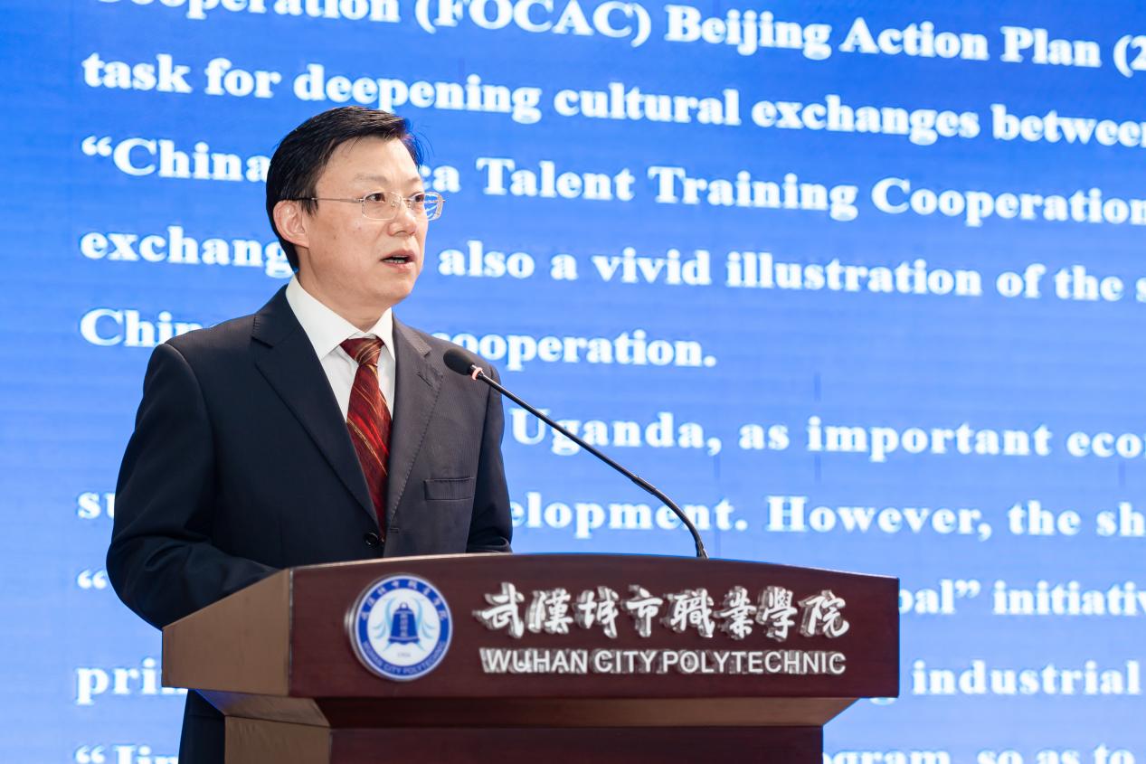 开班仪式上,学校党委副书记杨爱民代表学校致欢迎辞。他回顾了学校援外教师团队赴乌干达举办汉语培训班的历程,表示要秉持“荆楚技能工坊”项目所倡导的“教随产出、校企同行”理念,精准对接当地实际需求。多年来,学校深耕对非职教合作,从承办“中国武汉——乌干达恩德培职业教育培训项目”,到组建专业团队开发适配课程,始终都在践行扎根当地实际的教育合作。