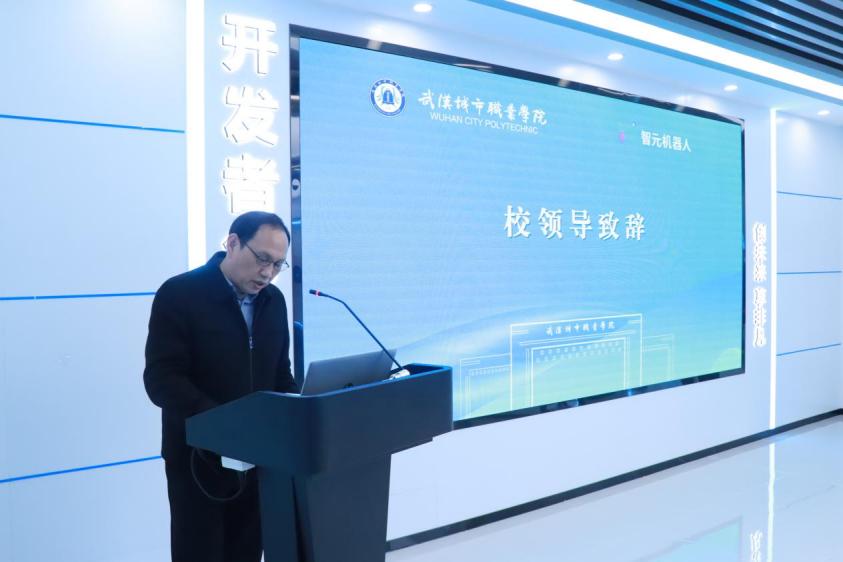 活动中,刘牧云作主题发言。他详细介绍了智元创新(上海)科技股份有限公司在通用人形机器人研发、具身智能大模型构建、多模态数据采集与应用等领域的核心成果与行业布局,深入分析了具身智能产业发展的前沿趋势与人才需求导向,并对校企合作寄予厚望。他表示,智元创新(上海)科技股份有限公司将充分发挥企业的技术优势、产业资源和实践平台优势,与武汉城市职业学院紧密携手,将产业真实项目、前沿技术融入人才培养全过程,共同培育符合产业发展需求的高素质、高技能人才。